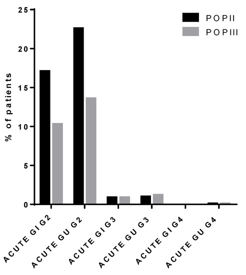Comparing the crude acute toxicity rate of the current series with that of POP II, there is a significantly (p < 0.0001) lower frequency of G2 cases in favor of the recent cohort, while data were similar for both G3-G4 GI and GU toxicity (Figure 3).