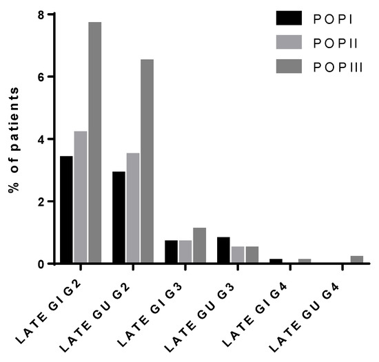 Overall, the treatment was well tolerated, as the majority of patients experienced only mild to moderate toxicities. In comparison to POP II, patients in the current series showed better tolerance to RT treatment with a lower crude rate of acute toxicity ≥ grade 2. Reported grade 4 acute urinary toxicity remained as low in POP III as it was in POP II (Figure 3). When analyzing the crude maximum late toxicity rates, most patients experienced mild toxicity (grade 2), while only 7 patients experienced grade 4 toxicity (6 patients GU and 1 GI, respectively) (Figure 4). Unexpectedly, patients treated with a total dose (EqD2) ≤ 74 Gy developed a higher incidence of acute and late toxicity, the likely reasons being the larger CTV-PTV margins used in this cohort in absence of IGRT.