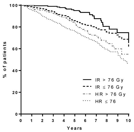 BRFS among intermediate risk patients (IR) and high risk patients (HR) treated with a total dose (EqD2) ≤ 76 Gy and > 76 Gy, log-rank p < 0.0001.