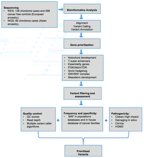 Overview of study samples and prioritization pipeline to evaluate rare and potentially pathogenic variants in genes of interest for chordoma.