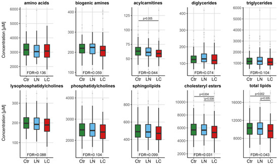 Aggregated concentrations of different classes of metabolites in serum samples of healthy controls (Ctr), individuals with benign lung nodules (LN), and lung cancer patients (LC). Boxplots show the minimum and maximum values, lower and upper quartile, and median (outliers are marked with gray circles); represented are FDR-corrected results of the Kruskal−Wallis test for a general variance and the posthoc test p-values for a significance of differences between pairwise compared groups (n = 154 in each group).