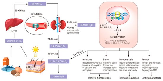 Carried by vitamin D binding proteins (VDBP) in the bloodstream, vitamin D reaches the liver, where it is hydroxylated by sterol 27-hydroxylase (CYP27A1) and converted to 25(OH)D, the most stable vitamin D metabolite with a serum circulation half-life of 15 days [24]. Thus, the serum concentration of 25(OH)D is used as a biomarker to determine the vitamin D status of a person [25]. There is a lack of consensus, however, regarding the optimal concentration of vitamin D in the blood. In the United States, an expert committee of the Food and Nutrition Board of the Institute of Medicine categorized the serum 25(OH)D levels as follows: deficiency, less than 30 nmol/L (12 ng/mL); inadequacy, between 30 nmol/L (12 ng/mL) and 50 nmol/L (20 ng/mL); normal, between 50 nmol/L (20 ng/mL) and 125 nmol/L (50 ng/mL); and high, higher than 125 nmol/L (50 ng/mL) [24]. The Endocrine Society defines the serum 25-(OH)D levels differently: deficiency, less than 20 ng/mL (50 nmol/L); insufficiency, 21–29 ng/mL (52 to 72 nmol/L) [26]. These cut-offs are based on the levels of parathyroid hormone and the activity of the intestinal calcium transporter that normalizes 25-(OH)D levels [27,28,29]. It should be noted that the total vitamin D concentration in blood is influenced by many factors, such as age, dietary habits, intestinal absorption capacity, liver and kidney functions, sex steroid levels (in particular estrogens), and genetic background [30,31]. Therefore, one should be cautious in defining the vitamin D status of a subject.
