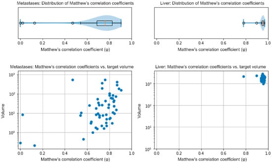 The median NELM volume in the 56 patients (internal validation) of the AI dev group was 17.25 cm3 (IQR: 4.48–60.93 cm3) as determined by the nnU-Net model and 16.17 cm3 (IQR: 4.87–58.16 cm3) in the radiologists’ manual segmentation. The median relative volume difference between the model’s and the radiologist’s segmentation of NELM was −3.7% (IQR: −24.54−+11.83%). The model showed a median φ of 0.76 (IQR: 0.68–0.83) for the segmentation of metastases (Figure 1, left side). Analysis of the data in a case-wise fashion identified three out of 56 patients (5.4%), whereby the model’s segmentation only achieved a weak overlap (φ < 0.2). Two out of these patients had very low NELM volume (0.1 and 0.2 cm3). The third patient showed atypical, hyperintense signal intensities of the metastases in HBP; NELM were subsequently missed by the model. Dividing the cohort by the median NELM volume (16.17 cm3) into high and low NELM volume, the model showed significant higher φin patients with higher NELM volume (median φ: 0.80; IQR: 0.73–0.84) compared to low NELM volume (median φ: 0.71; IQR: 0.64–0.78; p = 0.003). For liver segmentation, the median volume was 1639.9 cm3 (IQR: 1366.1–1960.7 cm3) in the manual segmentation and 1659.0 cm3 (IQR: 1404.2–1966.9 cm3) in the model’s segmentation. The median relative volume difference between the model’s and the manual segmentations of livers was +0.9% (IQR: −0.7−+4.2%). The model showed a median φ of 0.95 (IQR: 0.95–0.96) in liver segmentation (Figure 1, right side). The external validation (MCC cohort) confirmed the high accuracy of the model. The model achieved a median φof 0.86 (IQR: 0.81–0.91) in the segmentation of NELM and of 0.96 (IQR: 0.95–0.96) in liver segmentation.