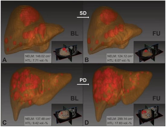 Assessment of therapeutic response in liver metastases, independently from primary tumor origin, is most commonly based on the Response Evaluation Criteria in Solid Tumors (RECIST, Version 1.1). RECIST1.1 is suitable for study cohorts and facilitates response evaluation by defining a limited number (maximum two per organ) of target lesions [58]. From a practical point, response criteria vary regarding increasing versus decreasing tumors. Partial response (PR) is defined as a decrease of at least 30% in the sum of the largest diameter of target lesions. By contrast, progressive disease is defined as increasing at least 20% of target lesions or the appearance of one or more new lesions in a 2D measurement [59]. Considering this somehow simplified approach, the pure volumetric determination of growth behavior should allow a more precise measuring method for therapeutic decision-making in the individual patient. The simplification of RECIST1.1 can lead to patients being interpreted incorrectly or inconsistently during their illness. The limitations of RECIST1.1 become even more evident when evaluating the effects of targeted molecular agents, especially in slow-growing tumors, such as NENs [60,61]. RECIST1.1 treatment response strongly depends on which target lesions were chosen at the baseline scan. Heterogeneous treatment response, which can be seen in different types of primary cancers and systemic treatments, is not represented by RECIST1.1 [62]. Additionally, volumetric measurement methods show a higher intra-observer reproducibility compared to RECIST1.1 [63]. Quantification of total HTL in clinical routine is not routinely performed, and in most cases, tumor load is visually estimated by the radiologist. However, several studies have shown that hepatic tumor burden is an important prognostic imaging marker [13,64,65]. Volumetric evaluation of the HTL, as performed by our model, provides useful information on lesion distribution and allows a more realistic quantification of hepatic tumor extent than the (2D) diameter measurements, which are commonly used [66]. In addition, the model considers all lesions, which would also allow capturing of heterogeneous treatment responses.