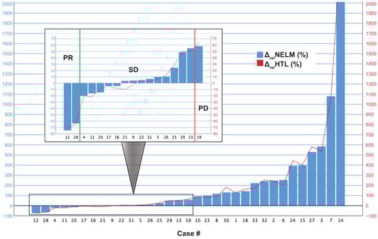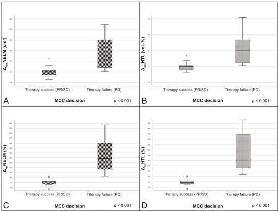 The case-wise analysis of the 33 MCC patients is summarized in Table 3. The case-wise analysis showed that the model correctly detected increased NELM volume in all of the 17 patients with therapeutic failure (100%). The ΔabsNELM increase in these 17 patients ranged from +3.02 cm3 to +864.45 cm3 and ΔabsHTL ranging from +0.18 vol.-% to +36.41 vol.-%. The relative increase of ΔrelNELM ranged from +58.52% to +4513.64% and in ΔrelHTL from +64.97% to +2497.20%. In patients with therapeutic success (n = 16), the ΔabsNELM ranged from −394.57 cm3 to −34.75 cm3 (in PR) and −35.70 cm3 to +61.56 cm3 (in SD) and the ΔabsHTL from −16.96 vol.-% to −1.73 vol.-% (in PR) and −1.64 vol.-% to +3.48 vol.-% (in SD). The relative change variables of ΔrelNELM ranged from −74.68% to −63.68% in PR and from −20.19% to 55.25% in SD, and the ΔrelHTL ranged from −71.13% to −65.03% in PR and from −21.23% to +50.51% in SD (Figure 4).
