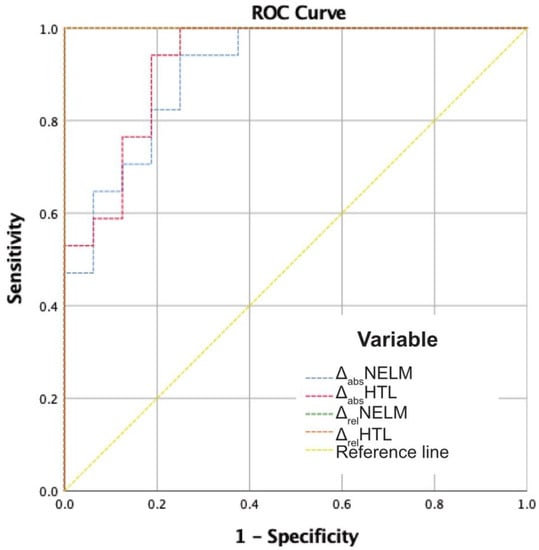 In the total cohort, ROC analysis of MCC decision and the relative changes (ΔrelNELM and ΔrelHTL) showed an area under the curve (AUC) of 1.000 (p < 0.001) for both variables. The absolute changes showed an AUC of 0.908 for ΔabsNELM and of 0.926 for ΔabsHTL (p < 0.001). To determine the best cutoff values for progressive disease, a Youden index was calculated. For ΔrelNELM, the highest Youden index (1.000; 100% sensitivity and 100% specificity) was found at the cutoff value +56.88%. For ΔrelHTL, the highest Youden index (1.000; 100% sensitivity and 100% specificity) was found at a cutoff value of +57.73% (Figure 5).
