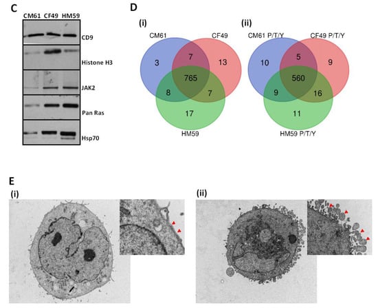 Characterization of extracellular vesicles secreted from patient derived CTC lines; (A): Representative images from transmission electron microscopy of concentrated EVs secreted from (i) CM61, (ii) CF49, and (iii) HM59 cell lines (Magnification ranges from 250,000× to 300,000×); (B): NanoSight (Malvern Pananalytical Inc, MA, USA) analysis of size and concentration of EVs secreted from the CTC lines with size in nm on X axis versus scattering intensity on Y axis for (i) CM61 CTC cell line, (ii) CF49 Cell line, and (iii) HM59 cell line. (C): Western blot analysis illustrating the expression of characteristic EV markers CD9, HSP70 (System Biosciences, Palo Alto, USA) and Histone H3 (Cell Signaling Technology, Danvers, USA), and PDAC signaling markers such as JAK2 (Cell Signaling Technology, Danvers, USA) and Pan RAS (Cell Signaling Technology, Danvers, USA). Lane 1: Lysate of EVs from CM61; Lane 2: Lysate of EVs from CF49; Lane 3: Lysate of EVs from HM59; (D): Distribution of (i) proteins and (ii) phosphoproteins identified in the three PDAC patient derived CTC cell lines CM61, CF49, and HM59; (E): Knockdown of TSG101 ESCRT0 protein in CM61 cell line was done with shRNAs from the TRC consortium. Silencing of this essential ESCRT pathway protein does not allow pinching of EVs from the surface of membrane, allowing them to accumulate on the membrane surface: (i) TEM of cell surface of CM61 cell line transduced with scramble shRNA. Inset image is magnified image of the CM61 plasma membrane and the arrows indicate a smooth plasma membrane with no accumulation of budding bodies or vesicles. (ii) CM61 cell line transduced with shRNAs targeting TSG101. Inset image shows a smooth plasma membrane being absent with accumulation of vesicular bodies and no secretion due to a defect in the secretion pathway. The arrows indicate the vesicles that are attached to the plasma membrane and are not released into the supernatant indicative of a defective secretion pathway.