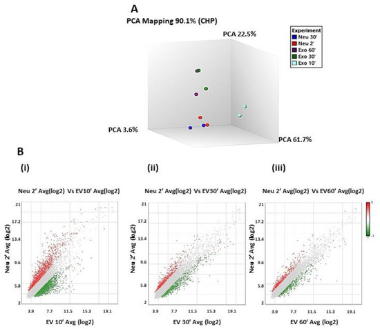 Transcriptomic analysis of CTC EVs incubated with neutrophils; (A): Principal Component Analysis (PCA) of microarray data obtained by hybridization of mRNA extracted from control neutrophils at time points (2′ and 30′) and experimental samples, i.e., neutrophils treated with EVs and collected at time points 2′, 30′, and 60′; (B): Scatter plot representing the average (log2) fold change of genes expressed in neutrophils at 2 min vs. average (log2) fold change of genes expressed in neutrophils treated with EVs from CM61 cell line at time points (i). 10′, (ii). 30′, and (iii). 60′.