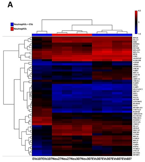 A comparative analysis of the transcriptome of the neutrophils treated with EVs collected at 10′ vs. neutrophils at 2′ showed 1676 genes (57.59%) that were upregulated, while 1234 (42.41%) genes were down regulated. Of the upregulated genes, 62.53% were multiple complex genes (genes whose classification locus could not be defined), 24.82% coding, 8.89% noncoding, 3.34% unassigned, and 0.42% were pseudogenes. Among the 1234 downregulated genes, 88.01% of the genes were multiple complex genes, 8.35% were coding genes, 3.08% were non-coding, and 0.57% genes with unassigned functions. In comparison with the 30′ time point, there were only 638 genes (86.36% multiple complex, 8.46% coding, 4.08% noncoding, and 1.1% genes with unassigned functions) that were upregulated and 511 genes that were downregulated (78.28% multiple complex, 8.41% coding, 8.02% noncoding, and 5.28% genes with unassigned functions). Analyzing the final time point, where the control neutrophils were compared with the co-cultured neutrophils at 60′, we identified 428 genes (86.45% multiple complex, 9.58% coding, 3.27% noncoding, and 0.7% genes with unassigned functions) upregulated and 462 genes downregulated (77.49% multiple complex, 8.87% coding, 7.58% noncoding, and 6.06% genes with unassigned functions). A detailed summary of the gene percentages is shown in Table 2. Scatter plots of the three comparisons are shown in Figure 2B. There is an observable decrease in the genes that are differentially regulated from the 10′ to the 60′ time point.