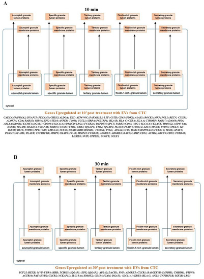 In order to understand whether these differentially modulated genes modulate certain specific signaling networks, a pathway analysis using curated pathways from the Reactome and NetPath was performed. In comparison to the naïve neutrophils, within the first 10 min of exposure to EVs, there is an increase in the olfactory, G alpha, and the GPC receptor signaling followed by keratinization, defensins, collagen formation, and trimerization pathways, along with pathways that are responsible for extracellular matrix organization. Interestingly, the pathways responsible for platelet degranulation are downregulated. Nearly 98 genes that characterize this pathway are suppressed. Furthermore, the innate immune system pathways are also down regulated. It is interesting to note that the translation initiation, elongation, and termination are suppressed, and so is RNA metabolism. With the next 30 min of interaction with EVs, there is a period of recovery where protein initiation, elongation, and termination pathways are upregulated again. The neutrophils go through a period of activated RAF-MAPK signaling and increase in transcription of genes responsible for repairing and restoring the balance in these cells. Based on these findings, we propose that the platelet degranulation pathway genes (21 genes) are upregulated primarily as a response to restore balance to the earlier suppression on EV exposure. However, the balance does not tilt in the favor of the neutralization of this pathway as the activation is only partial and there are more than 25 genes still being activated in the pathway tilting the balance towards suppression of the pathway in general. At 30 min of exposure to EVs, there is also a distinct suppression of the vesicle-mediated transport and the immune-related genes. At 60 min of exposure, NOTCH, JNK, and TLR cascades (TLR2, TLR4, TLR5, TLR7, TLR8 and TLR10) are activated as well. There is continued expression of genes modulating the protein expression being activated. Interestingly, the interplay between the neutrophil degranulation pathways continues with more genes being downregulated (23 genes) than expressed (17 genes) at 60′ pushing and maintaining the neutrophils to suppress the degranulation pathways. As for the reteplase activity pathway, within the first 10 min nearly 56 genes that modulate this pathway are downregulated, while at 30 min, there are 23 of these genes whose expression is upregulated to return the transcriptome to stasis. No other significant change was observed other than suppression of several biochemical pathways from the curated sets of genes from NetPath. A complete list of the significant NetPath and Reactome pathways annotated from the overexpressed or suppressed gene sets is given in Table S5 with the expression values of genes of the reteplase activity and neutrophil degranulation pathway identified from this study shown in Table S6. Expression heat maps of the genes identified in this study for reteplase and neutrophil degranulation specifically are shown in Figure 3B,C. We also wanted to see if the neutrophil degranulation genes are specifically identified in one particular component of the granulation pathway or not. A Reactome analysis indicates distribution across all granule specificities being downregulated at time point 10′ with lesser activation across the granular types in preceding time points. A detailed list of genes and enrichment in the precise granular component is shown in Figure 4.