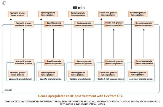 The neutrophils were separated into two groups: control and experiment. The experiment samples were incubated with freshly isolated EVs (5 μg/mL) concentrated from one of the CTC lines (CM61). A total of 108 neutrophils was taken for each experimental condition. Neutrophils were collected at 10′, 30′ and 60′ after co-culture with EVs. Control neutrophils were treated with HBSS (Thermo Fisher, Waltham, MA, USA), and samples were colected after similar time points. RNA from neutrophils was isolated using the RNeasy UCP Micro kit (Qiagen, Germantown, MD, USA), quantified and processed on Clariom S (Thermo Fisher, Waltham, MA, USA) arrays using IVT Pico kit (Thermo Fisher, Waltham, MA, USA). Extracted RNA underwent the GeneChip 3′ IVT Pico workflow prior to hybridization, washing, staining, and scanning of the Clariom S array. The 3′ IVT Pico workflow is completely described in the kit user guide, but is a multi-step process where extracted RNA are prepared to be hybridization-ready cDNA targets. Extracted RNA samples undergo the stepwise process of first-strand cDNA synthesis using reverse transcriptase of the RNA, cleanup of excess primers, 3′ adaptor synthesis, pre-IVT amplification, cRNA amplification, cRNA purification, 2nd-cycle ds-cDNA synthesis, template RNA removal, ds-cDNA purification and quantification, fragmentation and terminal Biotin labeling, and finally hybridization to the array. Following hybridization, the Clariom S arrays are washed, stained, and scanned using a GeneChip Scanner 3000 (Thermo Fisher, Waltham, MA, USA). The microarrays were processed at the Microarray Research Services Laboratory (MRSL) at Thermo Fisher Scientific, (Thermo Fisher, Santa Clara, CA, USA). Raw data from the Human Clariom S arrays were analyzed on the Transcriptome Analysis Console (Thermo Fisher, Waltham, MA, USA). The quality of the experiment was assessed based on the values of pos vs. neg auc and pm mean, which were calculated using the Affymetrix® Expression Console software (Thermo Fisher, Waltham, MA, USA). CEL files were processed for each replicate and experimental condition using the Affymetrix® Transcriptome Analysis Console software 4.0 (Thermo Fisher, Waltham, MA, USA). The CEL files were then subjected to normalization using the Signal Space Transformation-Robust Multiarray Analysis (SST-RMA) method [27] to generate CHP files. To analyze significantly differentially expressed gene (fold change ≥ ± 2, p value < 0.05). There was no significant difference between the neutrophils collected over different time points, so all comparisons were done against the 2-min time point of neutrophils treated with PBS. Neutrophil sample collected at time point 2-min is represented as 2′, while neutrophils treated with EVs and collected at time points 10′, 30′, and 60′ are, respectively, represented as EV10′, EV30′, and EV60′.