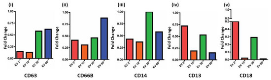Mature neutrophils are recognized by a segmented nucleus and an abundant number of cytoplasmic granules that contain a variety of proteins that play vital roles in engulfment, killing of foreign particles, help in cell–cell interactions, signaling, and modulation of the surrounding environment and extravasation [54]. Cytoplasmic granular fusion leads to compound exocytosis in two ways, either through the intra granular fusion in the cytoplasm or through the sequential fusion of granules to the same site on the plasma membrane. It is a tightly regulated process that is not completely understood. Several proteins regulate the formation of these cytoplasmic granules with the SNARE and RAB proteins playing a crucial central role. There are three types of cytoplasmic granules that are released by neutrophils which are the primary or the azurophil granules, secondary or specific granules and tertiary or gelatinase granules [55]. The microbicidal compartment being the primary granules, while secondary and tertiary granular proteins degrade the ECM and tertiary granules modulate neutrophil biology such as diapedesis or extravasation, cell adhesion, and superoxide anion production [56,57,58,59,60]. Markers were selected for analysis for each specific granule type; azurophil granules (CD63), specific granules (CD15 and CD66b), and secretory vesicles (CD13, CD14, and CD18) [61]. The expression of CD63 in neutrophils treated with EVs for 2′ and 10′ minute time points compared to control is less than 0.20-fold, which increases to 0.62-fold at 60′ post EV treatment [Figure 5(i)]. Likewise, expression of CD66b [Figure 5(ii)] is around 0.40-fold at the 2′, 10′, and 30′ time points and increases to nearly 0.88-fold at 60′. The secretory vesicle granule proteins CD14, CD13, and CD18 [Figure 5(iii), (iv), and (v)] show similar trends in changes in fold change; (CD14:0.40-fold at 2′, and 10′ treatments and becomes equal to expression of control at 30′ and then decreases to 0.58-fold as compared to control at 60′; CD13 and CD18: The expression fluctuates between 0.72-fold and 0.50-fold, respectively, at 2′ treatment, decreasing in both cases at 10 min and increasing again at 30′ and falling below at 60′ of treatment).