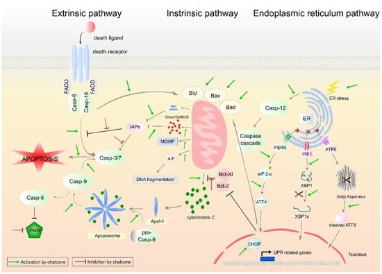 The ability of chalcones to induce apoptosis via the ER pathway has also been demonstrated. LicoA was mentioned above as an inducer of the intrinsic pathway of apoptosis [47]. However, these authors in the same article described also the ability of LicoA to induce ER stress. In LicoA-treated human lung cancer cells, they found increased expression of p-EIF2α and ATF, ER stress-related proteins, indicating that ER stress was involved in LicoA-induced cell death.