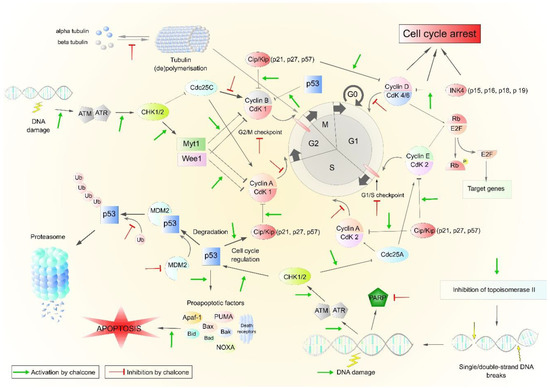 The antiproliferative activity of chalcones is closely linked to cell cycle blockade and subsequent induction of apoptosis [171]. Tumor cell transformation, which may be the keystone for the development of cancer, may cause cells to be unresponsive to regulatory mechanisms and begin to divide uncontrollably. In healthy cells, the cell cycle is very strictly regulated. Cell-cycle-regulating proteins include cyclins and cyclin-dependent protein kinases (CdKs), which are activated by CdK-activating kinases (CAKs) upon complex formation. The mechanism of action of chalcones in relation to the cell cycle is pleiotropic and includes an effect on cyclins and cyclin-dependent kinases (CDKs) [47,141,172,173], topoisomerases [113,130], tubulins [131], or CKI expression and degradation [172]. These mechanisms may lead to inhibition of proliferation and induction of apoptosis. Although chalcones can inhibit the cell cycle in different phases [54,57,135], they have been found to act mainly as antimitotic agents inhibiting cell cycle in the G2/M phase.
