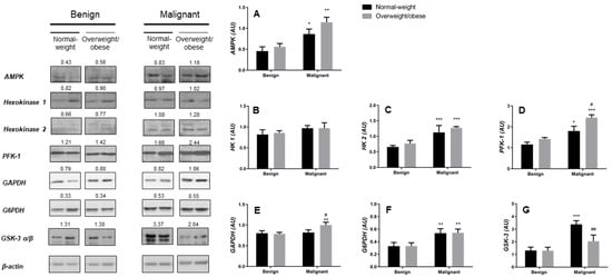 Figure 1. Breast cancer changes in glucose metabolic pathways and their relationship to obesity. Protein expression of 5′-AMP-activated protein kinase (AMPK, A), hexokinase 1 (HK 1, B), hexokinase 2 (HK 2, C), phosphofructokinase (PFK-1, D), glyceraldehyde-3-phosphate dehydrogenase (GAPDH, E), glucose-6-phosphate 1-dehydrogenase (G6PDH, F) and glycogen synthase kinase-3 (GSK-3 α/β, G) in benign and malignant breast tumor tissue of normal-weight (black) and overweight/obese (gray) women. The protein content is normalized to β-actin levels and expressed in arbitrary units (AU); mean values of densitometric analysis for each group are shown above respective bands. Two representative band images cut from the same blot are shown for each group (n = 9); each band is representative of three pooled samples. Images of whole uncut blots with values of densitometric analysis for each band are shown Figure S1. Bars represent average values ± S.E.M. * Comparison to respective benign counterpart, * p < 0.05, ** p < 0.01, *** p < 0.001. # Comparison to normal-weight malignant counterpart, # p < 0.05, ## p < 0.01.