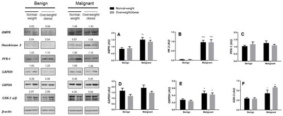 Figure 2. Breast cancer-associated adipose tissue changes in glucose metabolism irrespective of obesity. Protein expression of 5′-AMP-activated protein kinase (AMPK, A), hexokinase 2 (HK 2, B), phosphofructokinase (PFK-1, C), glyceraldehyde-3-phosphate dehydrogenase (GAPDH, D), glucose-6-phosphate 1-dehydrogenase (G6PDH, E), and glycogen synthase kinase-3 (GSK-3 α/β, F) in benign and malignant tumor-associated adipose tissue of normal-weight (black) and overweight/obese (gray) women. The protein content is normalized to β-actin levels and expressed in arbitrary units (AU); mean values of densitometric analysis for each group are shown above respective bands. Two representative band images cut from the same blot are shown for each group (n = 9); each band is representative of three pooled samples. Images of whole uncut blots with values of densitometric analysis for each band are shown Figure S1. Bars represent the average values ± S.E.M. * Comparison to respective benign counterpart, * p < 0.05, ** p < 0.01, *** p < 0.001.