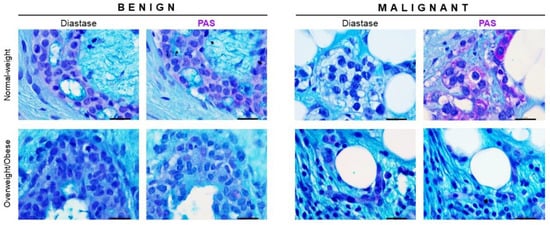 Figure 3. Glycogen content changes in breast cancer tissue are associated with obesity. Periodic Acid-Schiff (PAS) staining and light microscopy showing glycogen localization patterns in benign and malignant tumor tissues. Glycogen (purple staining) localization in breast cancer cells in malignant tumor tissue and breast epithelial cells in benign tumor tissue of normal-weight and overweight/obese premenopausal women. For each sample, PAS staining is presented next to the serial section pretreated with diastase, an enzyme that catalyzes glycogen hydrolysis. Magnification: ×100, orig. Scale bar: 20 μm.