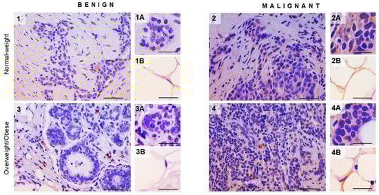 Figure 4. Hexokinase 2 expression in breast tumor and associated adipose tissue in normal-weight and overweight/obesepremenopausal women. Immunohistochemistry and light microscopy showing hexokinase 2 protein localization patterns in benign (panels 1 and 3) and malignant (panels 2 and 4) tumor tissue. Cell-specific hexokinase 2 (brown staining) protein localization in breast epithelial cells (inserts 1A and 3A) and adipocytes (1B and 3B) in benign tumor tissues and breast cancer cells (inserts 2A and 4A) and cancer-associated adipocytes (2B and 4B) in malignant tumor tissues of normal-weight (panels 1 and 2) and overweight/obese (panels 3 and 4) premenopausal women. Magnification: ×40 and ×100, orig., respectively. Scale bars: 50 μm and 20 μm, respectively.