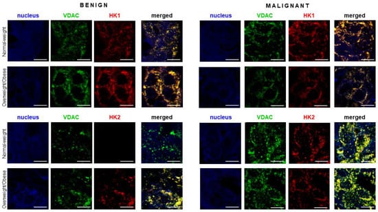 To analyze if metabolic reprogramming involving overexpression of HK 2 in malignant tissues is associated with its functional translocation to mitochondria, we analyzed colocalization patterns of HK 1 and HK 2 in relation to VDAC, a mitochondrial marker by immunofluorescent staining and confocal microscopy (Figure 5). The immunocytochemistry results support the protein expression data obtained by western blotting. As expected, HK 1 was constitutively expressed in all tumor tissues regardless of malignancy and obesity and colocalized with VDAC. For HK 2, immunofluorescence staining showed strong induction of HK 2 expression in malignant tumor tissues of normal-weight women compared to corresponding benign tumor tissues. Furthermore, HK 2 strongly colocalized with VDAC and was localized in mitochondria. Surprisingly, we also observed limited induction of HK 2 in benign tumor tissue of overweight/obese women.