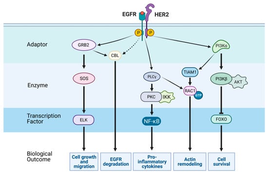 EGFR-mediated signaling pathways. Receptor tyrosine kinases (RTKs), such as EGFR, undergo rapid activation by means of growth factor binding, and subsequently they transmit signals through several pathways, to drive changes in cell phenotypes. Schematically shown are a heterodimer of EGFR and HER2, along with selected generic signaling routes comprising adaptors (green layer), enzymes (light blue layer), and transcription factors (blue layer). Note that CBL, an E3 ubiquitin ligase, is recruited directly or indirectly (via GRB2) to active EGFRs and sorts the latter to degradation in lysosomes. The active, GTP-bound form of RAC1 can be induced by several guanine nucleotide exchange factors (GEFs), including TIAM1 and phospholipase C-gamma, which acts as a GEF and a degrader of PI(4,5)P2. GRB2, growth factor receptor-bound protein 2; SOS, son of sevenless, CBL, Casitas B-lineage lymphoma; PLCg, phospholipase C gamma; PKC, protein kinase C; IKK, IκB kinase; NF-κB, nuclear factor κB; TIAM1, T-lymphoma invasion and metastasis-inducing protein 1; PI3K, phosphatidylinositol 3-kinase; AKT, AKR thymoma; FOXO, forkhead box O. This scheme was created using BioRender.com, accessed on 5 May 2021.