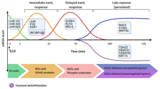 The timeline of transcription regulation and deSUMOylation following stimulation of EGFR. Immediately after the stimulus, a group of microRNAs (miRs), called ID-miRs, is downregulated. Next, the group of immediate-early genes (IEGs) undergoes up-regulation at the transcript level. Trailing the IEGs, the wave of delayed-early genes (DEGs), which encode cytokines, phosphatases and other inhibitors of growth factor signaling, undergoes up-regulation and switches-off the IEGs. Culminating the EGF-stimulated gene expression program, late-response genes display persistent up- (delayed upregulated genes, DUGs) or down-regulation (DDGs), and drive phenotypic changes. Note that posttranslational protein modifications, such as phosphorylation and deSUMOylation, occur in parallel to de-novo protein synthesis. This scheme was created using BioRender.com, accessed on 5 May 2021.
