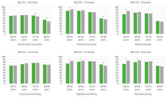 When stratified by age (Figure 2), we found a more diverse picture. Compared to controls, VLTCS aged 40–59 years reported lower physical and role functioning, while VLTCS aged 40–69 years reported lower cognitive and social functioning. However, VLTCS aged 70–99 years reported a better global health status/QoL, and VLTCS aged 80–99 years reported better physical and cognitive functioning than controls.