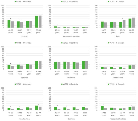 Regarding symptoms, VLTCS at age 40–69 years reported more fatigue and dyspnea compared with controls (Figure 3). Survivors aged 40–59 years reported more nausea and vomiting than controls, but in general, this symptom was rare. A lower level of pain among VLTCS compared with controls was evident in the 70–79-year age group. For constipation and diarrhea, VLTCS of all ages reported higher scores than controls, with highest differences for diarrhea at ages 40–79 years. Younger VLTCS aged 40–59 years compared with controls suffered from more financial difficulties, whereas VLTCS at age 80–99 years reported fewer financial difficulties than the control group.