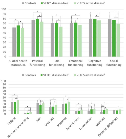 We further stratified VLTCS into disease-free and active-disease groups, as shown in Figure 4. All differences were statistically significant (p < 0.05) in global comparison. Subsequently, we calculated contrasts to evaluate subgroup differences. The advantage of VLTCS compared with controls in the global health status/QoL was evident only for disease-free survivors, whereas survivors with active disease did not differ significantly from controls. VLTCS with active disease reported lower physical, role, emotional, cognitive, and social functioning than both other groups. Regarding symptoms, only disease-free survivors reported lower pain, while survivors with active disease did not differ significantly from controls. VLTCS with active disease reported more fatigue, nausea and vomiting, dyspnea, insomnia, appetite loss, and financial difficulties than disease-free survivors and controls. For these scales, disease-free survivors did not differ significantly from controls. In contrast, constipation and diarrhea were reported more frequently not only by VLTCS with active disease compared with controls but also by disease-free VLTCS compared with controls.