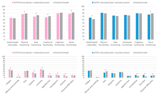 EORTC QLQ-C30 global health status/QoL, functioning scores, and symptom items and scores of female long-term cancer survivors compared with female controls and of male long-term cancer survivors compared with male controls, adjusted for age and education. VLTCS, very long-term cancer survivors (recruited via population-based cancer registries). Asterisks (*) mark statistically significant subgroup differences (p < 0.05).