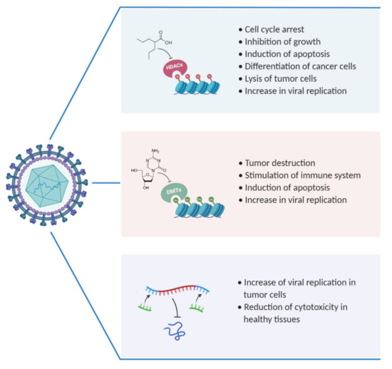 At the present, much evidence demonstrates that tumor cells are deregulated by epigenetic mechanisms, apart from genetic alterations. On the other hand, OVs are promising therapeutic agents which are developing in the cancer treatment field. They are great biotherapeutic platforms to be combined with epigenetic drugs, able to cut down cellular antiviral response, promote the destruction of cancer cells and potentiate the immune response (Figure 1). Although in many clinical trials, no mortality following virotherapy has been reported, except sporadically, the advancement of treatments in combination with other molecules, and the use of different oncolytic viruses, still raises safety concerns. Although genetic manipulation has improved the tropism of oncolytic viruses for cancer cells, it is possible to recur to genetic recombination or mutation with the consequent production of unexpected toxic effects. However, many studies report that the effects of virotherapy are generally well-tolerated and that the most common side effects, when present, are flu-like. One of the main mechanisms of resistance to virotherapy is represented by innate immunity. Through the production of neutralizing antibodies, the immune system can limit the ability of the virus to replicate sufficiently to spread into neighboring tumor tissues. In this case, the use of immunosuppressant drugs in the early stages of treatment could resolve the problem [326]. Unfortunately, this option could exclude immunocompromised patients or people with active viral infections. In the last decade, studies on the development and improvement of OVs at the preclinical level have increased. Furthermore, new strategies adopted, such as the introduction of epigenetic modulators in virotherapy, are bringing more safety and selectivity to cancer cells, increasingly reducing collateral damage to healthy cells [327]. However, an important feature reported by several studies is represented by viral pharmacodynamics and pharmacokinetics, which allows constant monitoring of the immune response and viral load, both essential for understanding the course of treatment and suggesting changes in the case of problems. Moreover, apart from combining OVs with other molecules, it should be very interesting to combine virotherapy with standard cancer therapeutics like chemotherapy and radiotherapy, with the aim to improve time survival in advanced cancer patients. For example, in a Phase I trial by Mell et al. [328] is GL-ONC, a modified oncolytic VV combined with cisplatin and radiotherapy in patients with advanced head and neck cancers which has shown to improve 1-year progress-free survival. In this scenario, the prospects for the future will be to improve combinations and OVs, increase efficiency, safety, and treatment times, with particular attention to those tumors that are difficult to eradicate and resistant to chemotherapy.