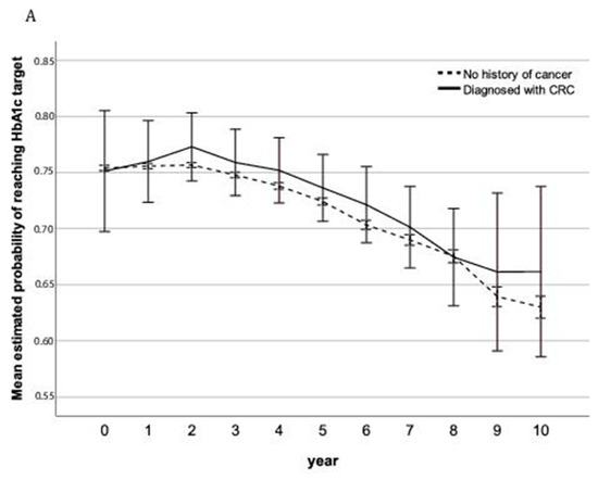 Descriptive analyses for baseline characteristics are presented as means with standard deviation for normally distributed values, and median and interquartile range (IQR) for skewed variables. Generalized mixed linear model was used to estimate the probability of reaching the target HbA1c level in each follow-up year and mixed linear model was used to estimate the mean HbA1c during follow-up. For all analyses, the status of cancer was used as a time-dependent variable [35]. In this way, the variable “follow-up year” captured the growth trajectory during the follow-up years for all patients, and the time-varying variable “status of CRC” captured the change in the growth rate that occurred after CRC diagnosis for patients diagnosed with CRC [36,37]. A preliminary inspection of the data, by using “follow-up year” as a categorical variable, revealed no substantial deviation of a linear trajectory of the average growth trajectory, therefore, “follow-up year” was used as a continuous variable. The interaction of “status of CRC” and “follow-up year” captured the annual change rates of the outcomes over years. To account for a patient-specific trajectory, a random intercept and a random slope were allowed in the model with an unstructured covariance matrix. Baseline confounders were adjusted as fixed effects. Assuming that missing data were “missing at random”, the mixed-effects model allowed the use of data for all patients who had at least one year follow-up.
