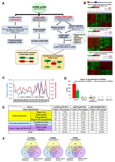 Three types of deregulated RNAs (circRNAs, miRNAs and mRNAs) and their clinical associations in HCC: (A) Schematic overview of the workflow implemented for identification of clinically relevant deregulated co-expressed circRNA-mRNA as well as circRNA-miRNA-mRNA competing endogenous RNA (ceRNA) networks. (B) Unsupervised hierarchical clustering analysis by Euclidean distance of deregulated circRNAs, miRNAs and mRNAs between 49 paired tumorous tissue and adjacent non-tumorous HCC tissue. (C) The proportion of total circRNAs (blue line) and differentially expressed circRNAs (red line) across human chromosomes. (D) Types of deregulated circRNAs. (E) Overall statistics for clinical features significantly associated with circRNAs, mRNAs and miRNAs. (F) Venn diagram showing the relationship of different clinical characteristics associated with deregulated circRNAs, miRNAs and mRNAs. For color in (E,F): Yellow: Tumor properties (including Tumor size, Tumor grade, Encapsulation and Degree of encapsulation); Blue: Invasion and metastasis (including Vascular invasion and Tumor invasion); Purple: Cancer stage and Survival.