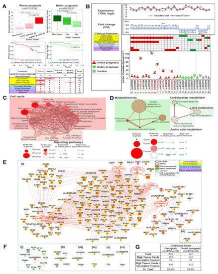 Prognostic circRNA-centric network modulating cell cycle and metabolism: (A) Prognostic RNA (e.g., circRNA) is defined as RNA that is differentially expressed in tumorous tissue vs. adjacent non-tumor, and is associated with worse/better clinical characteristics. Worse prognostic RNA is RNA whose expression is higher in tumors and the higher tumor expression is associated with clinical outcomes (e.g., higher grade tumors, absence of tumor capsule, worse overall survival) while better prognostic RNA is one whose expression is lower in tumors and the low tumor expression is associated with worse clinical outcomes. Examples of worse (left) and better prognostic cirRNAs (right) associated with tumor grade (top left), tumor capsule (top right) or overall survival (bottom) are shown. (B) Distribution of prognostic circRNAs that are significantly correlated with mRNAs (|r| > 0.7), including 17 worse prognostic circRNAs, 6 better prognostic circRNAs and 5 unclassified circRNAs. (C) Genes that are correlated with the 17 worse prognostic circRNAs reside mainly in the cell cycle and Rho GTPase signaling pathways. (D) Genes that are correlated with the six better prognostic circRNAs are mainly metallothionein genes or are involved in metabolism. (E) Clinically relevant deregulated co-expressed circRNA-mRNA network for the 17 worse prognostic circRNAs. The 5 nodal circRNAs are circled in red. (i) A large and complex network comprising 16 circRNAs and 158 genes. (ii) A singleton (one circRNA-one mRNA) network. (F) Clinically relevant, deregulated co-expressed circRNA-mRNA network for the six better prognostic circRNAs. (i) The largest network comprising one circRNA and 11 genes. (ii) The second largest network comprising one circRNA and 4 genes. (iii) The third largest network comprising one circRNA and 2 genes. (iv)(v)(vi) The singleton (one circRNA-one mRNA) networks. Ellipse: circRNAs; Rectangle: mRNAs; Red: Worse prognosis; Green: Better prognosis; Grey: Unclear prognosis; White: Not associated with any clinical features; outlines of nodes highlight the associated clinical features. Yellow: Tumor properties (including Tumor size, Tumor grade, Encapsulation and Degree of encapsulation); Blue: Invasion and metastasis (including Vascular invasion and Tumor invasion); Purple: Cancer stage and Survival. Red edges: Positive correlation. (G) Number of genes correlated with either the 17 worse prognostic circRNAs or the 5 nodal worse prognostic circRNAs that are associated with the different clinical characteristics.