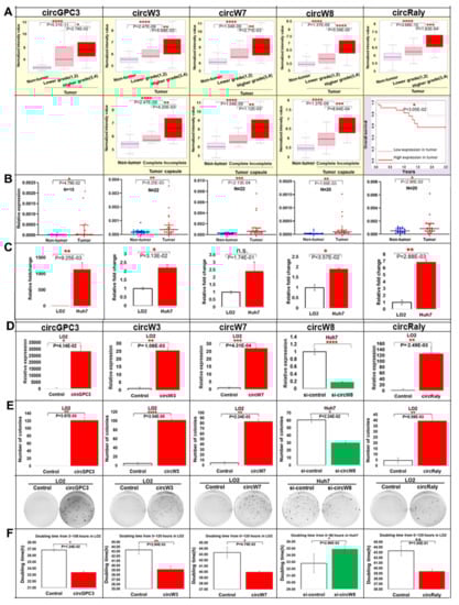 Overexpressed nodal circGPC3, circW3 and circW7 in LO2 were found to significantly increase the cell proliferation, leading to shortened doubling time (Figure 3D,F), while knockdown of circW8 in Huh7 significantly inhibited cell proliferation, increasing their doubling time (Figure 3D,F). A similar trend was observed for circRaly, although it did not reach statistical significance (Figure 3D,F and Figure S4F).