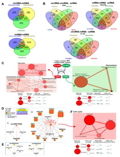 Clinically relevant differentially expressed circRNA-miRNA-mRNA ceRNA networks: (A) Venn diagrams showing the number of shared circRNA-miRNA (top) or miRNA-mRNA (bottom) that were determined through Spearman correlation analysis to be significant and/or predicted by miRanda and PITA algorithms to bind to each other. (B) Venn diagrams showing the number of circRNA-circRNA ceRNA (top left), mRNA-mRNA ceRNA (top right) and circRNA-mRNA ceRNA (bottom) that were found to show statistically confident interaction with either one or more than one of the four statistical analyses (Positive Correlation (PC), Partial Pearson Correlation (PPC), Sensitivity Partial Pearson Correlation (SPPC), Conditional Mutual Information (CMI)). Highly confident interaction is predicted by all statistical analyses/algorithms and is circled in red in each of the Venn diagrams. (C) Pathways of genes in the 41 highly confident circRNA-mRNA interactions. (D) Clinically relevant moderately confident (statistically significant based on PC and PPC statistical analyses only) circRNA-miRNA-mRNA ceRNA network associated with worse prognosis. Ellipse: circRNAs; Diamond: miRNA; Rectangle: mRNAs; Red: Worse prognosis; Green: Better prognosis; Grey: Unclear prognosis; White: Not associated with any clinical characteristics; outlines of nodes highlight the associated clinical features. Yellow: Tumor properties (including Tumor size, Tumor grade, Encapsulation and Degree of encapsulation); Purple: Cancer stage and Survival. Red edges: Positive correlation. Grey edges: Strength of correlation for circRNA-miRNA and miRNA-mRNA. (E) Clinically relevant moderately confident circRNA-miRNA-mRNA ceRNA network associated with better prognosis. Pathway of genes in the larger network (Dii) associated with circGPC3 is shown in (F).