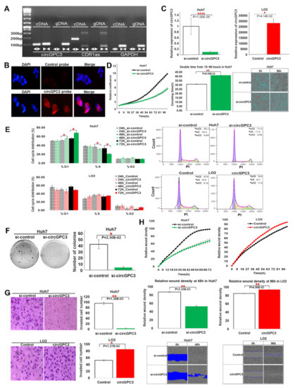 circGPC3 can be amplified using divergent primers from cDNA but not genomic DNA, suggesting that it is in the RNA form (Figure 5A). Fluorescence in-situ hybridization (FISH) revealed that circGPC3 mainly resides in the cytoplasm (Figure 5B). Live cell imaging showed that inhibition of circGPC3 expression in Huh7 significantly inhibited cell proliferation increasing their doubling time, while overexpression of circGPC3 in LO2 significantly increased the cell proliferation (Figure 3F and Figure 5C,D). These observations are consistent with the predicted oncogenic role of circGPC3. Cell-cycle analyses revealed that introduction of circGPC3 in LO2 led to more cells entering S/G2 phases and fewer in G0/G1 phases (although not significant), while the reverse is observed in Huh7 cells whose circGPC3 expression is inhibited with siRNAs (Figure 5E). Notably, attenuating the expression of circGPC3 in Huh7 cells led to significantly less soft-agar colony formation (Figure 5F).