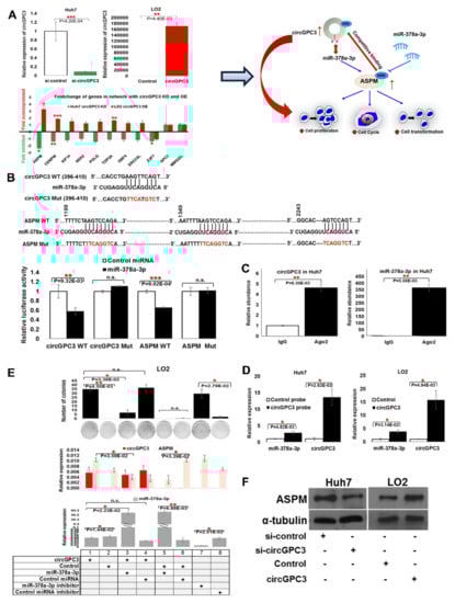 CircGPC3-centred ceRNA regulation through circGPC3/miR-378a-3p/ASPM axis: (A) Right: Validation of genes predicted to correlate with circGPC3 in clinically relevant circRNA-miRNA-mRNA ceRNA network (see Figure 5D). Left: Hypothesis of the role of circGPC3 in modulating various oncogenic phenotypes (e.g., cell proliferation, cell cycle and cell transformation) through the circGPC3/miR-378a-3p/ASPM axis. (B) Top: Sequence of Mutation (in red) generated for circGPC3 Mut and ASPM Mut (at the miRNA binding site within the protein coding sequence). Bottom: Luciferase assays with reporter constructs containing the wild-type or mutant circGPC3/ASPM downstream of a luciferase gene were performed after co-transfection with miR-378a-3p in HEK293T cells. (C) RNA Immunoprecipitation (RIP) experiments were performed using an antibody against Ago2 on extracts from Huh7 cells. Expression of circGPC3 and miR-378a-3p was detected. (D) Huh7 and circGPC3-expressing LO2 cell-lysates were probed with 3′-terminal-biotinylated-circGPC3 compared to control probes (Huh7 cells) or vector control (circGPC3-expressing LO2 cells). (E) circGPC3 promoted the cell transformation via the miR-378a-3p-ASPM pathway. (F) Protein level of ASPM after circGPC3 KD or OE. Data are from three independent experiments. Mean ± SEM (n.s.: not significant; * p < 0.05; ** p < 0.01; *** p < 0.001; by two-tailed Student’s t-test).