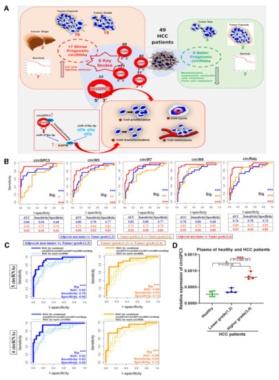 The clinical significance of a circRNA-centric regulatory network in HCC. (A) Model of clinically relevant circRNAs and networks associated with pertinent clinical characteristics and their role in modulating tumorigenesis. (B) ROC (Receiver operating characteristic) curve illustrating the diagnostic ability of the five nodal circRNAs to distinguish adjacent non-tumorous tissue from low tumor grade (1,2) (blue line), low tumor grade (1,2) from high tumor grade (3,4) (orange line) and adjacent non-tumorous tissue from high tumor grade (3,4) (red line). (C) Logistic regression and ROC curve analysis to evaluate the diagnostic ability of combined nodal circRNAs to distinguish adjacent non-tumorous tissue from low tumor grade (1,2) (blue line, left panel) and low tumor grade (1,2) from high tumor grade (3,4) (orange line, right panel). Top panel shows combination of all five nodal circRNAs while bottom panel shows combination of four of the five nodal circRNAs (except circW8). (D) Expression of circGPC3s in the plasma of healthy volunteers (green) or HCC patients (Blue: Low tumor grade (1,2); Red: High tumor grade (3,4)) (n = 4). Mean ± SEM (n.s.: not significant; * p < 0.05; ** p < 0.01; *** p < 0.001; by two-tailed Student’s t-test).