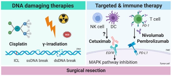 Approved and clinically applied treatment interventions for HNSCC. Early stage HNSCC is treated with either surgery or radiotherapy with photons or protons, while advanced stage HNSCC is treated by either upfront cisplatin-based chemoradiotherapy and salvage surgery when required, or upfront surgical resection with post-operative (chemo-)radiation. For patients unfit to receive cisplatin, the anti-EGFR monoclonal antibody cetuximab can be applied. Furthermore, patients with recurrent or metastatic disease are treated by the EXTREME protocol and with anti-PD-(L)1 antibodies, such as nivolumab and pembrolizumab, although response rates are low and clinical biomarkers for response are still under investigation. Abbreviations: ROS: reactive oxygen species, ICL: inter-strand crosslink, ssDNA break: single strand DNA break, dsDNA break: double strand DNA break, NK cell: natural killer cell, DC: dendritic cell, T cell: T lymphocyte, PD-1: programmed cell death protein 1, TME: tumor microenvironment, EGFR: epithelial growth factor receptor, PD-L1: programmed death-ligand 1, MAPK: mitogen-activated protein kinase.