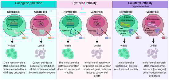 Tumor suppressor genes become inactivated during carcinogenesis through mutations or genomic deletion. In case of genomic deletion, a larger part of the chromosome is generally deleted and neighboring genes may be lost in this process. The collateral loss of these passenger genes can be exploited for therapy since these genes may be involved in cellular processes, while the gene dosage and associated protein expression has now been halved in the cancer cells. Loss of such passenger genes may also be compensated through redundancy by paralogue genes as postulated by Muller et al. [113]. Subsequent interference with the paralogue gene may lead to decreased cell survival (Figure 2, Right panel). To identify redundant paralogue genes after loss of a passenger gene, integrated analysis is required to match genomic copy number losses with vulnerabilities to interference with known paralogues [110,113,114,115].