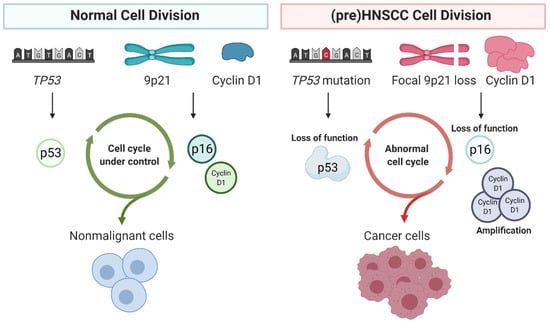 Cell cycle control in premalignant mucosal cells and HPV-negative HNSCC is impaired through frequent inactivation of p53 by (point) mutations. P16Ink4A encoded by the CDKN2A gene at chromosome 9p21 is frequently inactivated by either mutations or promotor methylation, or focal homozygous losses of chromosome 9p21. Combined with the amplification of the CCND1 gene which encodes for cell cycle regulating protein cyclin D1, these alterations result in loss of normal cell cycle control and increase tolerance for DNA damage and aneuploidy as often observed in cancer cells.