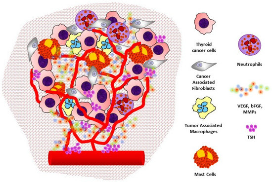 Tumor-associated macrophages (TAMs) are another pivotal component of the thyroid tumor microenvironment associated with tumor cell growth, spread, and poor prognosis [22,23]. In the tumor microenvironment, TAMs contribute to the anti-inflammatory status because of their high expression of interleukin-10 (IL-10) and mannose receptor (MR, CD206), and low expression of IL-12 [24,25]. It has been shown that TAMs present an M2-like activated status, differently from the M1-like circulating macrophages [26,27]. TAMs contribute to angiogenesis of tumors with an increased production of proangiogenic factors, such as vascular endothelial growth factor (VEGF), platelet derived growth factor (PDGF), and basic fibroblast growth factor (bFGF), and produce a high amount of matrix metalloproteases (MMPs), which are responsible for ECM remodeling and facilitate tumor cells spread and invasion [28,29]. The relationship between positive tryptase mast cell (MCs) infiltration and thyroid cancer invasiveness or extrathyroidal extension has been demonstrated. A significantly more abundant presence and distribution of MCs in the intratumoral and peritumoral areas of thyroid cancer has also been shown with respect to adenoma [30,31]. MCs also produce a broad spectrum of chemokines (CXCL8/IL-8, CCL25/TECK, CXCL10/IP-10, CXCL1/GRO-α), interleukins (IL-6), and other molecules (TNF-α) that are involved in the epithelial-to-mesenchymal transition (EMT) activation of thyroid cancer cells [32,33]. Moreover, MCs recruited by several tumor-derived chemotactic factors, such as stem cell factor, VEGF, chemokines, and cytokines, histologically are localized close to epithelia, fibroblasts, and blood and lymphatic vessels and are involved in wound healing, angiogenesis, and lymphangiogenesis [32,33,34]. Neutrophils are recruited by thyroid cancer cells by releasing CXCL8/IL-8 and granulocyte colony-stimulating factor [35]. In the tumor microenvironment, neutrophils produce and release angiogenic cytokines (onconstatin-M, VEGF-A) and their granule proteins (elastase), which induce cancer cell proliferation, invasiveness, and angiogenesis [36,37,38]. Our group’s complete gene expression profile study demonstrated that the microenvironment components surrounding the thyroid cancer cells express a genomic profile different from that of normal ST [39]. The results of this study indicate that interactions between tumor cells and ST induce in the ST the modulation of genes involved in the control of apoptosis, metabolism, cell movement, cell response to hypoxia, and cell proliferation [39].