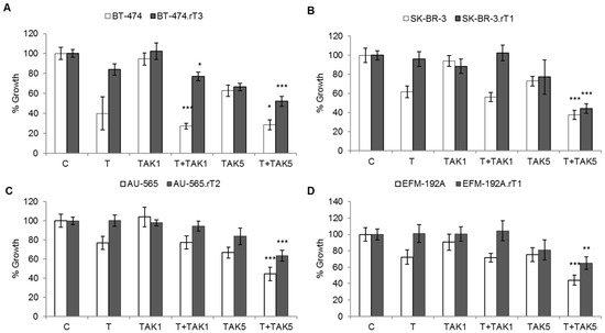 Decrease in mTOR activation status by TAK-228 affects trastuzumab sensitivity. Sensitive and trastuzumab-resistant cells were treated for seven days with DMSO, 15 μg/mL trastuzumab (T), 1 or 5 nM TAK-228 (TAK), or a combination of 15 μg/mL trastuzumab plus 1 or 5 nM TAK-228. Viable cells were then counted by trypan blue exclusion. Viability is presented as a percentage of the DMSO-treated control vector group. Error bars represent standard deviation between replicates (n ≥ 3). * denotes p ≤ 0.05, ** denotes p ≤ 0.01 and *** denotes p ≤ 0.001. (A) BT-474 sensitive (BT474) and trastuzumab-resistant (BT-474.rT3) cells. (B) SK-BR-3 sensitive (SK-BR-3) and trastuzumab-resistant (SK-BR-3.rT1) cells. (C) AU-565 sensitive (AU565) and trastuzumab-resistant (AU-565.rT2) cells. (D) EFM-192A sensitive (EFM-192A) and trastuzumab-resistant (EFM-192A.rT1) cells.