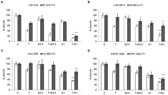 Effect of blocking mTOR activation by everolimus on trastuzumab sensitivity in trastuzumab-sensitive and trastuzumab-acquired resistance cell lines. Sensitive and trastuzumab-resistant cells were treated for seven days with DMSO, 15 μg/mL trastuzumab (T), 0.5 or 1 nM everolimus (E), or a combination of 15 μg/mL trastuzumab plus 0.5 or 1 nM everolimus. Viable cells were then counted by trypan blue exclusion. Viability is presented as a percentage of the DMSO-treated control vector group. Error bars represent standard deviation between replicates (n ≥ 2). * denotes p ≤ 0.05, ** denotes p ≤ 0.01 and *** denotes p ≤ 0.001. (A) BT-474 sensitive (BT474) and trastuzumab-resistant (BT-474.rT3) cells. (B) SK-BR-3 sensitive (SK-BR3) and trastuzumab-resistant (SK-BR-3.rT1) cells. (C) AU-565 sensitive (AU-565) and trastuzumab-resistant (AU-565.rT2) cells. (D) EFM-192A sensitive (EFM192A) and trastuzumab-resistant (EFM-192A.rT1) cells.
