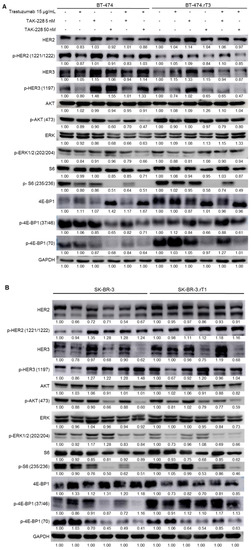 In summary, the combined treatment decreased the phosphorylation levels of HER2/HER3, diminished PI3K/AKT/mTOR signalling and limited ERK phosphorylation, as a direct consequence of the TAK-228 mechanism of action.
