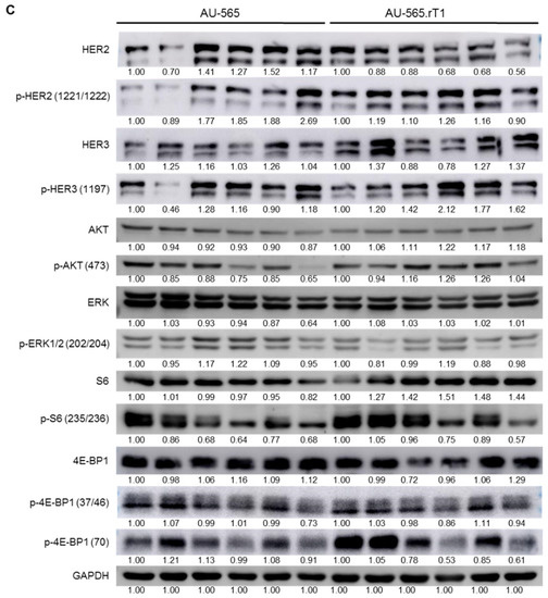 - Brünner-Kubath, C.; Shabbir, W.; Saferding, V.; Wagner, R.; Singer, C.F.; Valent, P.; Berger, W.; Marian, B.; Zielinski, C.C.; Grusch, M.; et al. The PI3 kinase/mTOR blocker NVP-BEZ235 overrides resistance against irreversible ErbB inhibitors in breast cancer cells. Breast Cancer Res. Treat. 2011, 129, 387–400. [Google Scholar] [CrossRef] [PubMed]