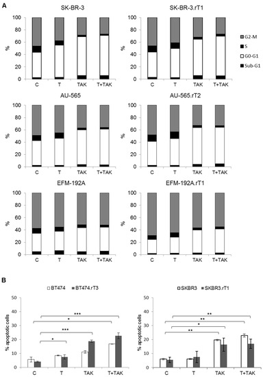 (A) Cell cycle arrest induced by trastuzumab and TAK-228 in trastuzumab-sensitive and -resistant cell lines. Cell lines were treated with 15 µg/mL trastuzumab (T), 0.5 µM TAK-228 (TAK) or a combination (T+TAK). Cell cycle arrest was analysed by flow cytometry after 24 h. (B) Apoptosis induced by trastuzumab and TAK-228 in trastuzumab sensitive and resistant cell lines. Cell lines were treated with 15 µg/mL trastuzumab (T), 0.5 µM TAK-228 (TAK) or the combination (T+TAK). Apoptosis was measured after 72 h by Annexin V positive staining by flow cytometry. Data are expressed as mean ± SD from three independent experiments. * denotes p ≤ 0.05, ** denotes p ≤ 0.01 and *** denotes p ≤ 0.001.