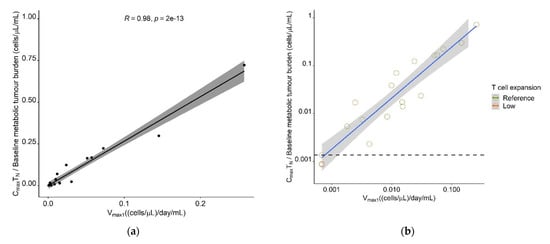 The model-estimated maximum expansion capacity, Vmax1, allowed to identify a patient’s expansion (sub-)population, which was associated with survival; thus, we aimed to determine a cut-off value in this parameter, which would support survival prediction. Furthermore, we aimed to translate Vmax1 into a predictor variable, which would be easily derivable in a clinical setting and leverage, but not require the use of the model. As a measurable clinical composite score (CCS) describing T cell expansion, inspired by a similar concept in anti-PD1 checkpoint blockade [39] and supported by a previous correlative analysis [50], the ratio of observed Cmax ((cells·µL−1))/baseline metabolic tumor volume (mL), denoted in Equation (12), was positively correlated with Vmax1 for all CAR-T cell phenotypes (TN: r = 0.98, TCM: r = 0.95, TEM: r = 0.94, TEFF: r = 0.86, Tall: r = 0.94). As the highest correlation was observed for TN (Figure 9a), the CCS for TN (CCSTN) was taken forward as a possible predictor for survival.