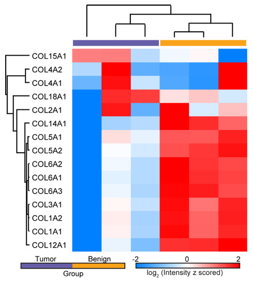 As shown in the cluster map in Figure 1, 15 single α-chains from different collagen isoforms were present in all samples, and statistical proteomic landscape differences were found between the two groups. Interestingly, we observed decreased expression levels of many of these chains in the tumor samples (e.g., those for COL1, COL3, COL5, COL6, COL12, and COL14). Moreover, differences in multiple single chains of the same collagen isoform were detected (e.g., COL1A1 and COL1A2), improving the confidence of our observations. These findings support the existence of unique matrisome features in each group, where there were larger intergroup differences than intragroup variations. This was also borne out by analysis of the principal components (not shown). A full list of identified and quantified proteins can be found in the supplemental spreadsheet.