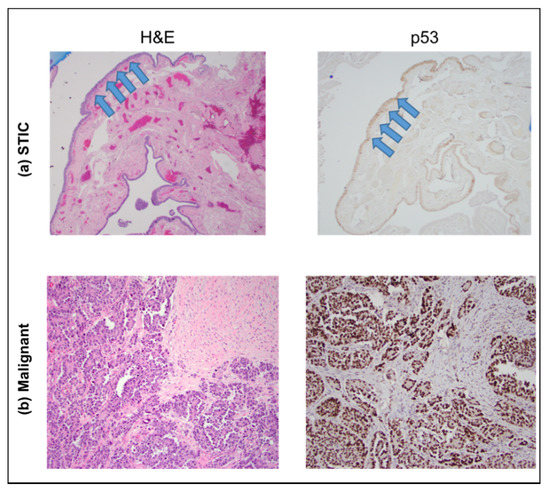 H&E (left) and p53 (right) staining of sections showing a STIC lesion (top, (a) images) and HGSOC (bottom, (b) images), respectively. The STIC lesion is confined to the fallopian tube epithelial surface (arrows), whereas the HGSOC forms a destructive, expansile lesion within the stroma of the involved tissue. The images were acquired at 40×.